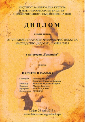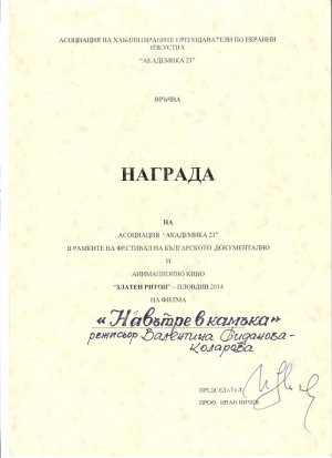 ПЪРВА НАГРАДА ЗА СЦЕНАРИЙ, РЕЖИСУРА, ОПЕРАТОРСКО МАЙСТОРСТВО, ХУДОЖНИК, АНИМАТОР, МУЗИКА И МУЗИКАЛНО ОФОРМЛЕНИЕ - Festival of Euro-Med Contemporary Arts „Culture Versus Crisis“ - Фондация „Анна Линд“-Българската мрежа - Радомир, 23-25 май 2013 г.